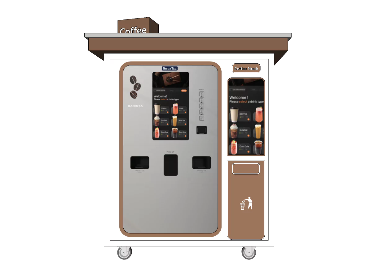 The placement selection of vending machines is not limited to conventional places such as shopping malls, office buildings, and schools. SUNLIT TEC is ingeniously incorporating vending machines into containers or adding wheels to their elaborate “decoration”. In this way, the vending machine instantly transforms into a dynamic and mobile unmanned vending station, able to freely shuttle to any location it desires. SUNLIT TEC’s newly launched Sparkling Coffee Cabin and Coffee Box Gravity Station are a perfect collision between vending machines and mobile homes, giving vending machines a unique and exclusive “home”.